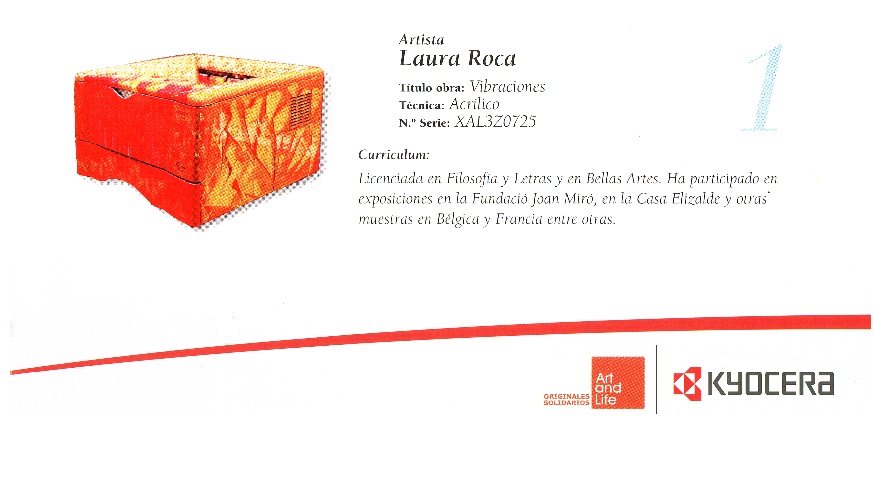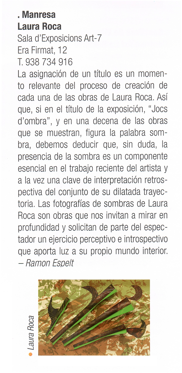 En aturar-nos davant d’una obra de Laura Roca, ho hem de fer pausadament, sense presses, i deixar que la vista sigui la porta del nostre cor, que aquest es vagi obrint a mesura que anem descobrint sensacions que, de ben segur, es convertiran en emocions. Els subtils matisos dels lleugers canvis de tonalitats, amb l’empremta de les tènues textures, ens porten a la lectura poètica dels grafismes del gest de la mà, una relació entre el cos i l’intel·lecte. Les formes abstractes que contemplem són l’esdevenir de les onades, de la vida, del temps que envolta la nostra trajectòria, com el corrent de les aigües d’un riu que s’endu més enllà les fulles, les pedres, les alegries, les penes; des de dins de les seves aigües no es percep la força del moviment, tot flueix junt en un gran embolcall, és des de fora que veiem córrer el temps. Laura Roca està a la riba del nostre riu, i atura per nosaltres aquells moments que  ens mostren, a través de les sensacions, els sentiments que han donat raó d’ ésser a la nostra sensibilitat. Obre doncs els finestrons i deixa’t recrear amb l’emoció, dóna-li l’existència a l’obra, que ella t’omplirà de vida. Pere Bruix i Riera La Sala Coma Estadella presenta “Jocs d’ombra” de Laura Roca, una exposición en torno al tema de la sombra. Ésta, como reflejo distorsionado de la realidad, la transforma y llena de misterio y simbolismo. Las manchas y sombras proyectadas por la luz y la inestabilidad constante de sus variaciones, constituyen a la vez un reflejo de la propia existencia. La sombra puede aludir también a la “sombra interior”, aquella parte más desconocida e íntima en la que se sitúan los archivos personales de cada uno. La exposición incluye pintura, obra sobre tela y papel y algunos montajes fotográficos. – P.V. Ressenya de l’exposició Jocs d’ombra, de Lleida, publicada en el nº 152 de Revistart. Laura Roca va exposar a la sala Coma Estadella del Col·legi d’Aparelladors, de l’11 de març a l’1 d’abril del 2011, la seva obra Jocs d’ombra, una mostra d’una quarantena de pintures, acrílics, teles, papers, caixes de llum i muntatges fotogràfics que donen a conèixer el contrast de llum i ombra de forma variada. Article publicat a la revista BIC en motiu de l’exposició “Jocs d’ombra”, realitzada a la sala COMA ESTADELLA de Lleida, al març 2011. Publicació del Col·legi d’Aparelladors, Arquitectes Tècnics i Enginyers d’Edificació de Lleida, nº 154, juny 2011. En aquesta exposició col·lectiva volem promoure i ensenyar amb sobrietat i harmonia les diverses formes en què una artista es pot expressar. El món de l’art està construït de diverses vessants i tècniques artístiques i és per aquest motiu que neix la idea d’organitzar Expressions Femenines; una exposició de dones que veuen en la pintura, dibuix, escultura, etc., la seva forma d’exterioritzar els seus pensaments, idees i sentiments. Cada dona és única, cada artista és original i autèntica. Reproducció d’una de les obres de la sèrie “Ombra il·lustrada”, publicada en el catàleg Miradas de mujeres, 2ª edició, març 2013, Espanya. La artista Laura Roca expuso en la exposición colectiva “Expresiones femeninas”, inscrita en el Ciclo Miradas de Mujeres 2013. En esta muestra presentó una caja de luz, óleos y fotografías de sombras retocadas con “frottage” de su serie “Ombra il·lustrada”. También presenta su obra más reciente al Salón de Arte que organiza un nuevo espacio, donde se darán cita una centena de artistas en la ciudad de Hospitalet, espacio120. Ressenya publicada a la revista Revistart (nº 163), en motiu de la participació a dues exposicions col·lectives, a Barcelona i L’Hospitalet, al 2013 Licenciada en Filosofía y Letras y en Bellas Artes. Ha participado en exposiciones en la Fundació Joan Miró, en la Casa Elizalde y otras muestras en Bélgica y Francia entre otras. Reproducció de la impressora “Vibracions” en el catàleg publicat per Art and Life  i Kyocera, en motiu de la participació al I Certamen de Impresoras solidarias, realitzat a Barcelona, al juny 2004. L’Espai d’Art del CAATB acull fins al 6 de novembre una exposició que recull el treball artístic de la pintora Laura Roca. Les obres mostren la faceta més abstracta de l’autora. Ressenya publicada a L’informatiu (nº 306) –revista del Col·legi d’Aparelladors i Arquitectes Tècnics de Barcelona-, en motiu de l’exposició presentada a l’Espai d’art, al 2008. La asignación de un título es un momento relevante del proceso de creación de cada una de las obras de Laura Roca. Así que, si en el título de la exposición, “Jocs d’ombra”, y en una decena de las obras que se muestran, figura la palabra sombra, debemos deducir que, sin duda, la presencia de la sombra es un componente esencial en el trabajo reciente del artista y a la vez una clave de interpretación retrospectiva del conjunto de su dilatada trayectoria. Las fotografias de sombras de Laura Roca son obras que nos invitan a mirar en profundidad y solicitan de parte del espectador un ejercicio perceptivo e introspectivo que aporta luz a su propio mundo interior. Ramon Espelt Ressenya publicada a la revista Revistart (nº 155) en motiu de l’exposició “Jocs d’ombra”, realitzada a la galeria ART-7, de Manresa, al juny 2011. Laura Roca expone en la sala Coma Estadella del Col·legi d’Aparelladors desde ayer y hasta el 1 de abril su obra Jocs d’ombra. Una muestra de unas cuarenta obras que dan a conocer el contraste de luz y sombra de forma variada a través de pintura sobre tela, papel, óleo y acrílico e imágenes de un montaje basado en la vida que el artista pretende sacar a la luz con el fin de enseñar otra cara de la realidad. Article publicat en el diari La Mañana, de Lleida, en motiu de l’exposició “Jocs d’ombra”, realitzada a la sala COMA ESTADELLA de Lleida, al mar